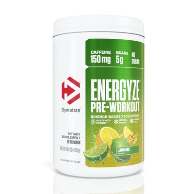 Dymatize Energyze Preworkout is a delicious energy boost to help you crush your fitness goals. Each serving contains 150mg of caffeine, 5g BCAAs and No Sugar. Energyze is formulated with a Performance Blend of 50mg l-theanine, 500mg l-tyrosine, 4g l-citrulline and 150mg caffeine to help you focus on your goal, enhance your performance and support recovery. No beta-alanine means no uncomfortable tingle or post-performance crash. Drink 15-30 mins before physical activity. Available in three (3) refreshing flavors: Strawberry Lemonade, Peach Mango and Lemon Lime.