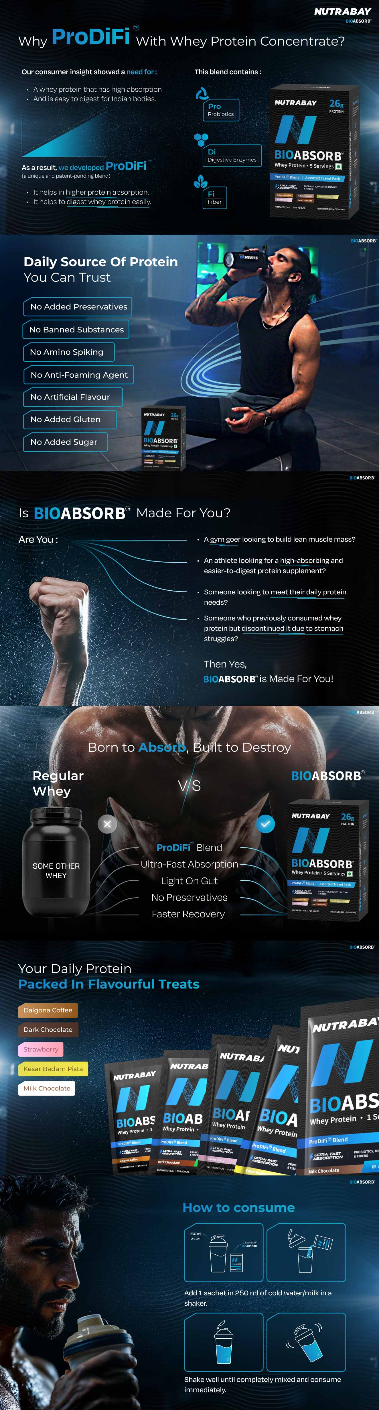 Nutrabay BioAbsorb™ Whey Protein is a protein supplement that's super light on your digestive system yet helps you get superior muscle growth and recovery. It has an innovative formulation in which whey protein concentrate is enriched with the patent-pending ProDiFi™ blend. ProDiFi™ stands for probiotics, digestive enzymes, and dietary fiber. This unique blend ensures the whey protein is easily digested and quickly absorbed in your body.
