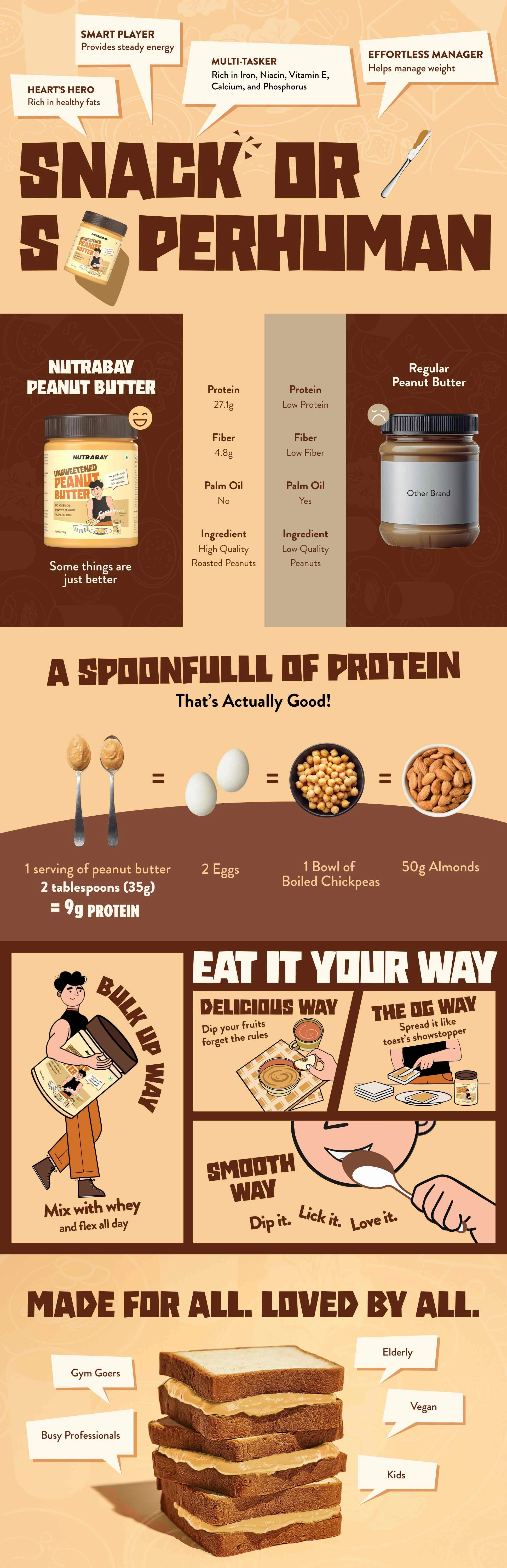 Smooth and indulgent, this creamy unsweetened peanut butter delivers 27.14g of protein and 4.89g of fiber per 100g, making it one of the best peanut butter options in India for clean eating. With zero added sugar, no preservatives, and no hydrogenated oils, it’s a staple for anyone looking to lose weight, build muscle, or eat healthier. This no sugar pure unsweetened peanut butter is also ideal for gym enthusiasts who want real fuel without the sugar crash. Whether you’re blending it into your protein shake, spreading it on multigrain bread, or pairing it with apples or bananas, this all natural peanut butter fits perfectly into both weight loss and weight gain routines. It offers a creamy texture and rich roasted peanut flavour, proving that you don’t need sweeteners to enjoy indulgence. This is a go-to option for people searching for peanut butter without palm oil or artificial ingredients.