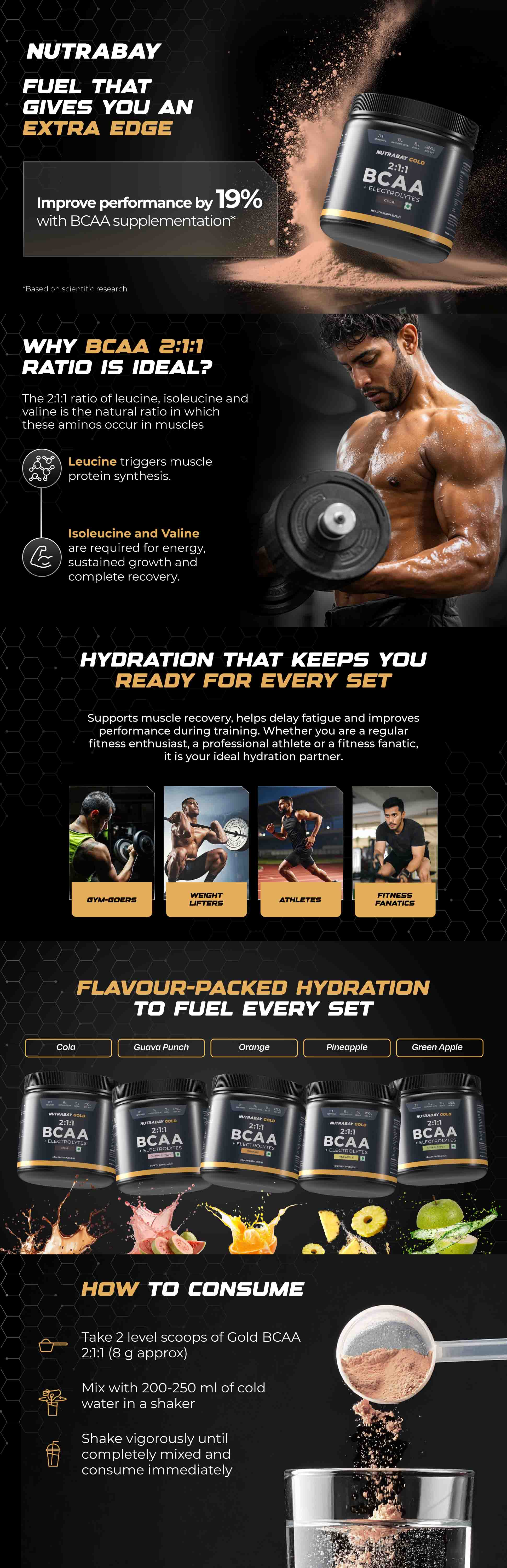 Nutrabay Gold BCAA 2:1:1 with Electrolytes is a premium blend of BCAA having a high ratio of L-Leucine. Branched-chain amino acids are components of protein that maintain muscle tissue during intense exercise. They function as anabolic agents, which allow the body to maximize fat loss and minimize muscle loss. They are rapidly depleted from the muscles when training. Taking them pre-workout and/or during your session can delay fatigue. Taking them post-workout or with a post-workout meal will lower muscle damage and feed the muscles faster to keep you in an anabolic state.