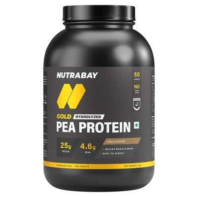 Nutrabay Gold Pea Protein is a high-quality plant based protein powder made from hydrolyzed pea protein which is extracted from nutrient-rich yellow peas.This product offers great bioavailability, smooth digestion, and full nutrition support, making it ideal for vegans, beginners, and anybody looking for a clean, dairy free substitute for whey.