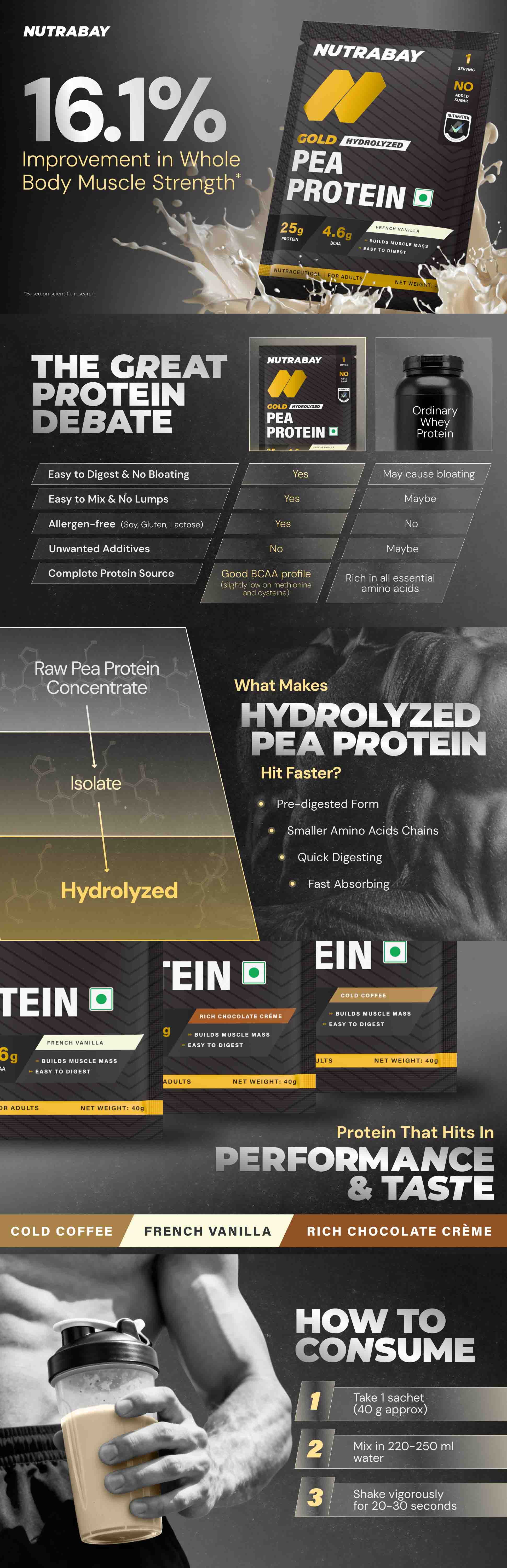 With a high protein content of 25 g and 4.6 g of BCAA, each dose promotes healthy weight management, muscle growth, and maintenance. For individuals who are lactose intolerant or want a mild, plant-based product, it's perfect. Nutrabay Gold Pea Protein, which comes in delectable Rich Chocolate Crème, French Vanilla, and Cold Coffee flavours, is simple to use in shakes, smoothies, and everyday pea protein recipes.