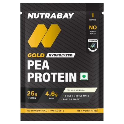 Nutrabay Gold Pea Protein is a high-quality plant based protein powder made from hydrolyzed pea protein which is extracted from nutrient-rich yellow peas.This product offers great bioavailability, smooth digestion, and full nutrition support, making it ideal for vegans, beginners, and anybody looking for a clean, dairy free substitute for whey.