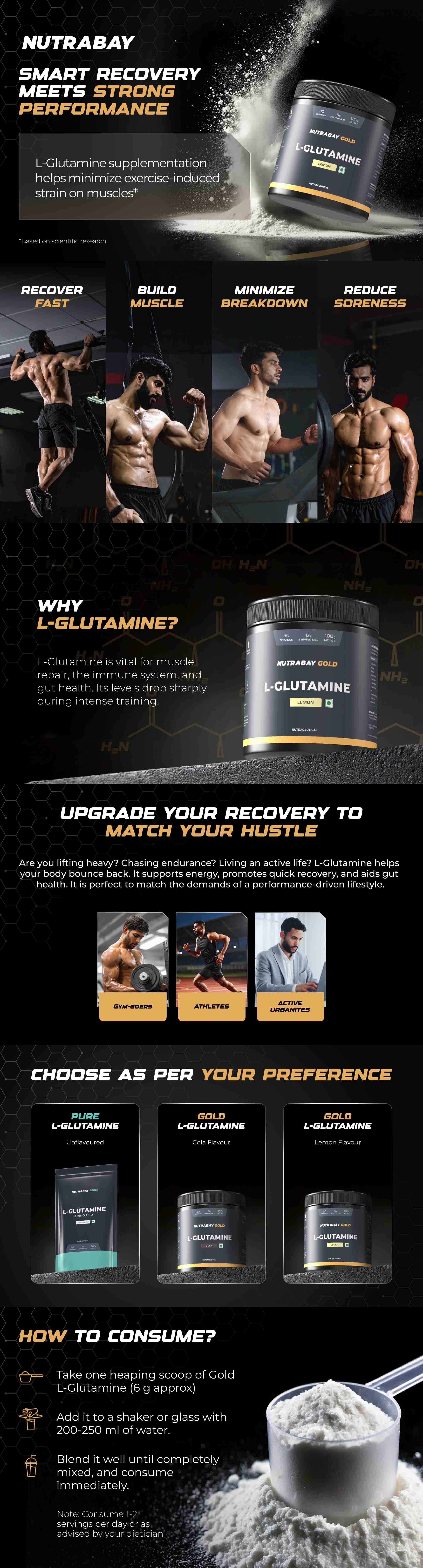Nutrabay Gold L-Glutamine is a conditionally essential amino acid found in your muscles and is the primary transporter of nitrogen into your muscle cells. During intense training, it's levels are greatly depleted in your body, which decreases strength, stamina and recovery. L-Glutamine supplementation may support a positive nitrogen balance, minimize breakdown of muscle and improve protein metabolism.
