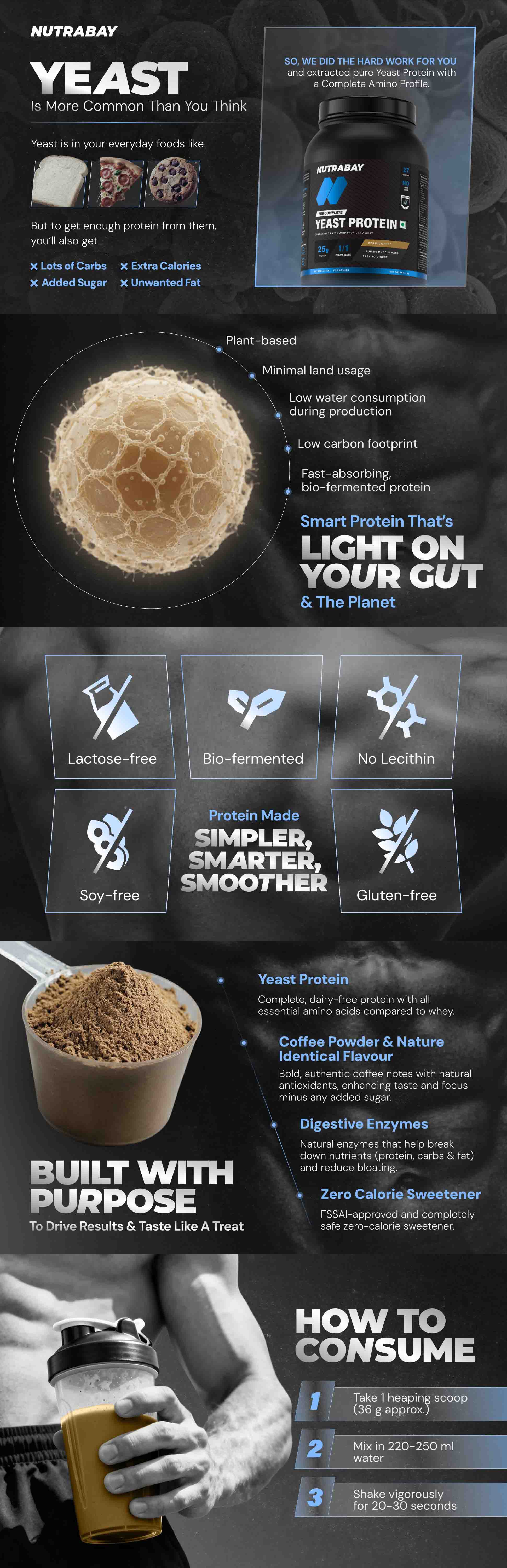 Nutrabay Yeast Protein is a fermented yeast protein powder for those seeking a full, easy-to-digest, and gut-friendly protein source. With 25 g protein, 6.7 g BCAA & PDCAAS Score of 1, this is a perfect choice for someone who is looking for a protein supplement without dairy, soy, or allergies as it provides all the important amino acids found in animal protein and is made from premium fermented yeast protein. This yeast based protein supplement promotes recuperation, vitality, and general health, regardless of your objectives, muscle growth, weight loss, or daily nourishment.
